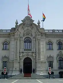 - El Palacio Municipal limeño con las banderas de Lima, la nacional y la supuesta bandera inca.