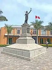 Los trabajos de la instalación de la estatua y la base fueron hechos por Florentino Palma. Se utilizó granito blanco de Amancaes. Además de la escultura se hizo fundir y burilar una placa de bronce que decía “Homenaje de la colonia francesa a la República del Perú en el primer centenario de su Independencia”. La escultura venía acompañada de cuatro candelabros ornamentales de bronce y hierro de 4,55 m. El monumento fue colocado en una plaza construida a cuenta del gobierno. La obra estuvo a cargo de la importante constructora “Foundation”.