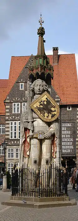 Con documentos falsificados, los ciudadanos de Bremen se arrogaron el derecho de agregar el escudo imperial a la estatua. El escudo contiene el águila imperial bicéfala, con una inscripción en el borde que anuncia la libertad concedida por Carlomagno a la ciudad. La inscripción completa es la siguiente: