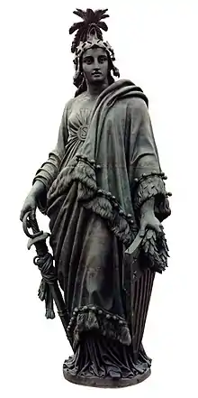 La estatua representa una figura femenina que lleva un casco militar y sostiene una espada en la vaina en su mano derecha y una corona de laurel y un escudo en su mano izquierda.