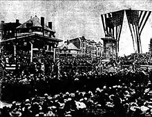 La dedicación del monumento se planeó por primera vez para el 18 de octubre de 1906, coincidiendo con la 37ª reunión anual de la Sociedad del Ejército del Potomac. Un incendio en los trabajos de pulido de MacMonnies le impidió terminar el pedestal a tiempo, por lo que la dedicación y la reunión se reprogramaron para mayo siguiente.[6] Durante la demora, MacMonnies exhibió la estatua en el Salón de Otoño de 1906 en París antes de enviarla a los Estados Unidos.[10] La reunión comenzó el 1 de mayo de 1907, con eventos de apertura celebrados en el Teatro Belasco (sitio actual del Edificio de los Tribunales Nacionales Howard T. Markey), la Galería de Arte Corcoran y el Edificio Thomas Jefferson.[14]