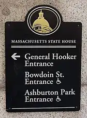 Un letrero afuera de la Casa del Estado de Massachusetts señala las tres entradas públicas, una de las cuales lleva el nombre del General Hooker.