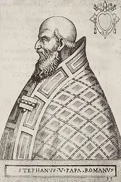 Esteban IV, nació en el seno de una familia aristocrática, su breve pontificado, de tan solo siete meses de duración, se inicia con su Consagración, ordenando al pueblo romano que prestase juramento de fidelidad al rey de los francos, Ludovico Pío, para a continuación trasladarse a Reims donde procedió a coronarlo como Emperador.