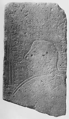 ![]() Losa funeraria con el grabado de un guerrero e inscripciones | ||