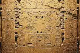 ![]() Lápida de piedra con personaje antropomorfo descubierta en Chavín de Huántar en 1972. | ||