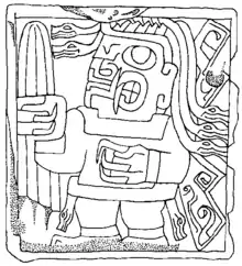 - Lápida VI-NW7 ('trompetero, 'pututero'), contigua al personaje en la lápida VI-NW6, se representa a un ser antropomorfo de perfil, caminando hacia la escalinata occidental (o escalera suroeste) sosteniendo una caracola o pututo con su brazo derecho y soplándola.[26]