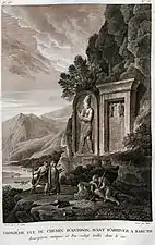 Para acomodar el pasaje, tiene un camino de más de dos yardas de ancho cortado a lo largo de su costado, a una gran altura sobre el agua; siendo obra del emperador Antonino... El recuerdo de ese buen trabajo se perpetúa mediante una inscripción, grabada en una mesa allanada en el costado de la roca natural, no lejos de la entrada al camino... Al pasar por este camino, observamos, en los lados de la roca sobre nosotros, varias tablas de figuras talladas; que parecía prometer algo de antigüedad... como si el viejo camino se hubiera ido en esa región, antes de que Antonino cortara el otro pasaje más conveniente un poco más abajo. En varios lugares por aquí, vimos extrañas figuras antiguas de hombres, talladas en la roca natural, y en tamaño igual a la vida. Cerca de cada figura había una mesa grande, alisada en el costado de la roca y bordeada con molduras. Tanto las efigies como las tablas parecían haber sido escritas en la antigüedad por todas partes: pero los personajes están ahora tan desfigurados, que nada más que sus huellas eran visibles; solo había una de las figuras que tenía tanto sus lineamientos como sus inscripciones enteras.