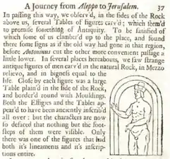 - Maundrell, Henry (1703), Journey from Aleppo to Jerusalem at Easter A.D. 1697, Oxford, pp. 36-37.