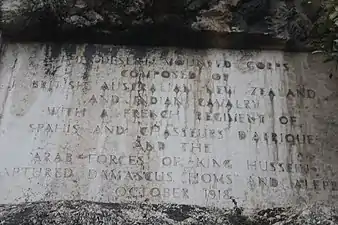 Dos inscripciones (1919 y 1930) marcan la persecución de Haritan, cuando las fuerzas aliadas tomaron Damasco, Homs y Aleppo en octubre de 1918 hacia el final de la Primera Guerra Mundial . [4] La primera inscripción está dedicada al Cuerpo Montado del Desierto de Harry Chauvel, y la segunda a los contingentes de Australia, Nueva Zelanda, India y Francia, así como al ejército sharifiano de Hussein bin Ali, Sharif de La Meca.
