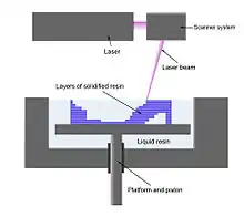 La estereolitografía es un proceso de fabricación por adición que emplea resina que cura mediante luz ultravioleta en un tanque, y un láser ultravioleta para construir los objetos. Los objetos tridimensionales se obtienen mediante la adición sucesiva de finas capas, impresas una encima de otra. Cada capa es una sección transversal del objeto que el láser traza en la superficie de la resina, que es el material consumible. La resina líquida cura y se solidifica mediante la exposición al láser de luz ultravioleta, quedando así la capa recién solidificada pegada a la capa previa que existía debajo suya.
