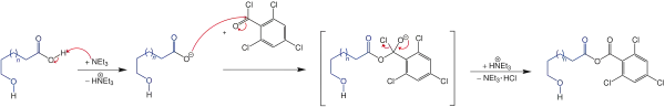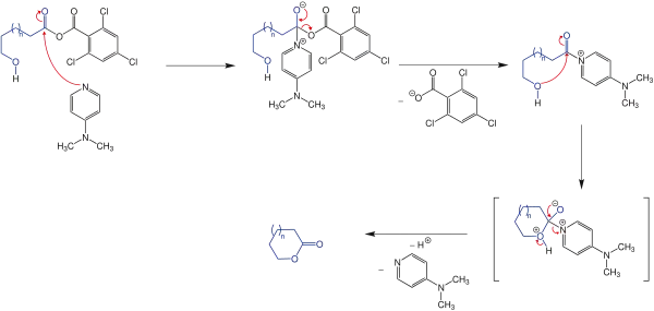El carboxilato alifático se adiciona al carbono carbonílico del reactivo de Yamaguchi, formando un anhídrido mixto, el cual es atacado regioselectivamente por el DMAP en el carbono menos impedido, produciendo el DMAP sustituido con el acilo.