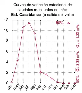 Su régimen es estrictamente pluvial.[2]: 326 En 2016 un informe de la Comisión Nacional de Riego publicó la siguiente curva de su caudal:[notas 1]