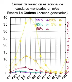 El caudal del río (en un lugar fijo) varía en el tiempo, por lo que existen varias formas de representarlo. Una de ellas son las curvas de variación estacional que, tras largos periodos de mediciones, predicen estadísticamente el caudal mínimo que lleva el río con una probabilidad dada, llamada probabilidad de excedencia. La curva de color rojo ocre (con ) muestra los caudales mensuales con probabilidad de excedencia de un 50%. Esto quiere decir que ese mes se han medido igual cantidad de caudales mayores que caudales menores a esa cantidad. Eso es la mediana (estadística), que se denota Qe, de la serie de caudales de ese mes. La media (estadística) es el promedio matemático de los caudales de ese mes y se denota .