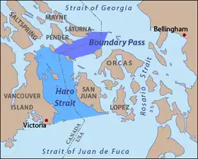![]() El estrecho de Haro (parte del estrecho de Georgia, entre la ciudad de Victoria y la isla de San Juan) | ||