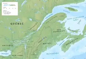 ![]() Vista de satélite de la península de Gaspesia, en la que aparece en parte el estrecho de Jacques Cartier (arriba) | ||