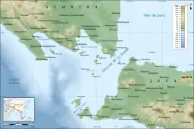 - Esta obra contiene una traducción derivada de «Sunda Strait» de Wikipedia en inglés, publicada por sus editores bajo la Licencia de documentación libre de GNU y la Licencia Creative Commons Atribución-CompartirIgual 3.0 Unported.