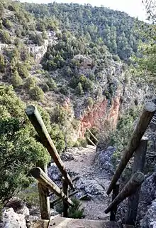 - Detalle de mirador por debajo de los Estrechos del Cañamar, Ruta de los Estrechos del Ebrón, en El Cuervo (Teruel).