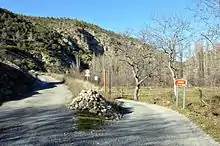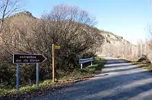 - Detalle de señalización vertical por debajo de los Estrechos del Cañamar, Ruta de los Estrechos del Ebrón, en El Cuervo (Teruel).
