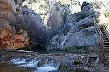 - Detalle de pasaderas en la roca por encima de los Estrechos del Cañamar, Ruta de los Estrechos del Ebrón, en Tormón (Teruel).