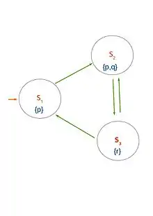 Una estructura de Kripke es una variación del sistema de transición, originalmente propuesta por Saul Kripke,[1] usada en Verificación de modelos.[2] para representar el comportamiento de un sistema. Es básicamente un grafo cuyos nodos representan estados alcanzables del sistema y cuyas aristas representan transiciones de estados. Una función de etiquetado mapea cada nodo a un conjunto de propiedades que se cumple en el estado correspondiente. Las lógicas temporales son interpretadas tradicionalmente en términos de estructuras de Kripke.