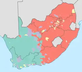 La Agencia de Estadísticas de Sudáfrica, abreviada Stats SA, considera que en el país existen cinco categorías o grupos raciales. El 79,4% de la población se considera negra (unos 46,8 millones), el 9,2% se considera blanco (5,4 millones), el 8,8% mestizo (5,2 millones) y el 2,6% indio o asiático (1,5 millones). En el primer censo de 1911, los blancos eran el 22%.[3] Hay 11 idiomas oficiales, zulú (22,7%), xhosa (16%), afrikáans (13,5%), inglés (9,6%), sepedi (9,1%), setsuana (6,7%), sesoto (7,6%), xitsonga (4,5%), suazi (2,5%), tsivenda (2,4%) y ndebele (2,1%). Pôr otro lado, el 81.2% de los sudafricanos se consideran cristianos, el 3,7% se identifica con otra fe y el 15% con ninguna en particular. Se estima que el 18,8% de la población vive con sida, unos 7 millones de individuos. Cada 42 segundos, el país tiene un habitante más, unas dos mil personas diarias, descontando los fallecimientos. Superan los dos millones de habitantes, las ciudades de Johannesburgo (4,4 millones en la zona metropolitana), Ciudad del Cabo y Ethekwini, con 3,7 y 3,4 millones, Ekurhuleni, Tshwane y Nelson Mandela Bay[4][5]