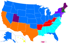 Los norteamericanos blancos son la mayoría en cuarenta y nueve de los cincuenta estados, con Hawái como la excepción. El Distrito de Columbia, que no es un estado, también tiene una mayoría no blanca.[11] Los blancos no hispánicos, sin embargo, son la mayoría en cuarenta y seis estados, con Hawái, Nuevo México, California, y Texas, así como el Distrito de Columbia, como las excepciones.[12] Estos cinco tienen "mayorías minoritarias", es decir, grupos minoritarios son la población mayoritaria.