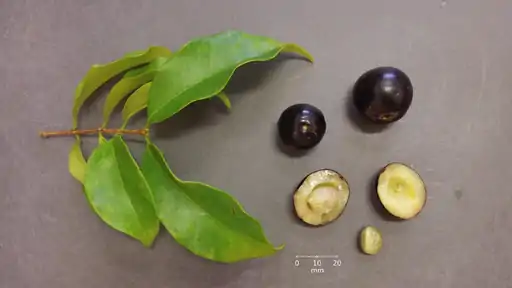 Las frutas maduran entre febrero y marzo. La fruta madura es una baya redonda o ligeramente alargada, hasta el 20 mm de ancho y 25 mm de largo. Tiene una piel púrpura-negra delgada y una húmeda, firme, pulpa blanquecina alrededor de 3 a 5 mm de espesor, en torno a una sola (rara vez dos) semillas sueltas. Es comestible, moderadamente dulce, con un aroma similar a (pero menos intensa que) la de la jabuticaba.[5]