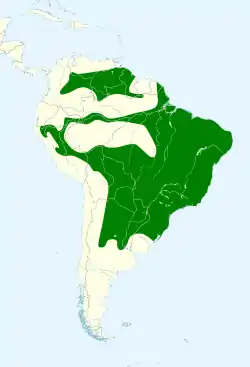 Puede encontrarse en los siguientes países: Argentina, Bolivia, Brasil, Colombia, Ecuador, Guayana Francesa, Guayana, Paraguay, Perú, Suriname, Uruguay y Venezuela.