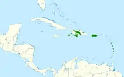 Su hábitat natural son las selvas tropicales húmedas de todas las islas principales de las Antillas Menores y las Antillas Mayores, desde La Española hacia el este, aunque también se encuentra en arboledas degradadas.