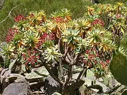 De hábito arbustivo, puede sobrepasar los 2 metros de altura con tallos y ramas suculentas sin espinas. Tiene hojas largas, de color verde azulado, formando una roseta en el extremo de las ramas. Las flores tienen brácteas de más de 1 cm, de color rojo oscuro.