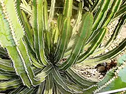 Es un planta perenne columnar suculenta con 5-7 ángulos en el tallo que alcanza los 2 metros de altura y cuyos bordes tienen las espinas a pares y tienen 1-2 cm de longitud.