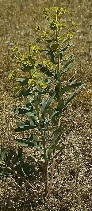 Esta lechetrezna se caracteriza porque las inflorescencias aparecen agrupadas en dos o tres umbelas superpuestas y bien definidas en la parte alta de los tallos. Esta estructura no se repite en ninguna otra Euphorbia. Se trata de una especie perenne con hojas estrechamente lanceoladas. Vive en los claros de los matorrales y campos abandonados. Florece en abril y mayo[1]