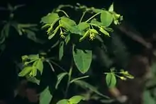 E una planta perenne herbácea arbolada, con riizoma rastrero que alcanza un tamaño de entre 20 y 40 cm de altura. Sus verdes y brillantes hojas están dispuestas una frente a otra y miden hasta 7 cm de largo. La forma es lanceolada con la parte inferior pubescente. Entre las inflorescencias en cada caso las dos primeras hojas son opuestas y llamativo color verdoso al amarillo dorado. El período de floración se extiende de abril a junio. La cápsula de la fruta es verrugosa exterior.