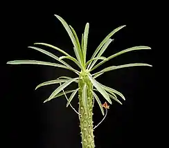 Tiene el tallo erecto, simple y columnar cuando es joven, después se ramifica, con una larga parte cónica basal, ramas erguidas, subparalelas, cilíndricas, cubiertas con tubérculos cónicos hexagonales. Con hoja caduca. Inflorescencias en pedúnculos solitarios en las axilas de las hojas, con 3-6 brácteas dispersas a lo largo de ellas y una espiral de 3 formando una copa alrededor del solitario involucro en su ápice, sin espinas. El fruto en forma de cápsula con semillas elipsoides de color marrón oscuro.[1]