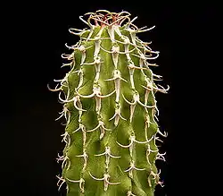 Es una planta suculenta perennifolia con un tallo erecto solitario que alcanza un tamaño de 1,3 m de altura y 8 cm de diámetro; tallo ramificado sólo cuando se daña en el ápice, cilíndrico, de 5-8 cm de espesor, con 13 a 17 ángulos, los ángulos separados por surcos profundos, dentados, con dientes de 5-15 mm; espinosos.[1]
