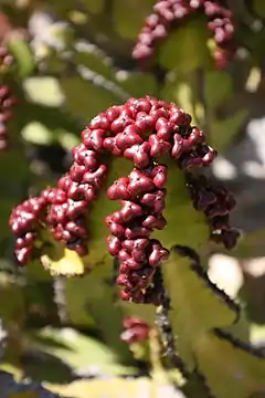 El fruto es de una 3 cápsulas lobuladas de 15 x 8 mm de largo y de color verde. Las marcas también son visibles en el sector de las frutas que aparezcan en septiembre y octubre en adelante y en superposición con el tiempo de floración.[1]
