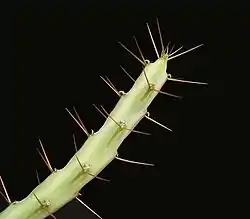 Es una planta suculenta perennifolia con un rizoma carnoso, densamente ramificada, formando mechones erectos de 20 cm de altura y ± 30 cm de diámetro, a veces extendida, rara vez estolonífera, con ramas cilíndricas, de ± 8 mm de espesor y 20 cm de largo, con dientes de 1,5 cm.[1]