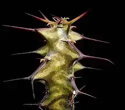 Es una planta perenne suculenta, erecta o trepadora de ± 1 m de altura, laxamente ramificadas, las ramas tetrangulares, de 1 cm de espesor; ángulos con dientes prominentes de 1-2 cm, espinosa, cápsulas y semillas desconocidas.[1]