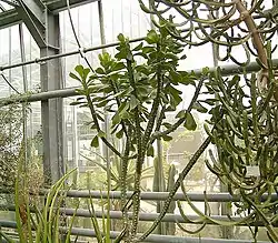 Es una planta con porte de árbol de hasta 6 m de altura, con 3-4 ramas angulosas y con las hojas en la punta de las ramas, de hasta 12 cm de longitud. Es una planta suculenta con hojas erectas de hoja caduca y de gran tamaño (12x6 cm), generalmente similares al cactus, ramas gruesas y carnosas, 1,5-3,5 cm de espesor, 3-5 angulares con espinas en pares a lo largo de los bordes.[2]