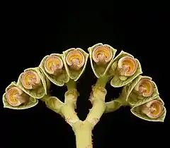 Euphorbia: nombre genérico que deriva del médico griego del rey Juba II de Mauritania (52 a 50 a. C. - 23), Euphorbus, en su honor – o en alusión a su gran vientre – ya que usaba médicamente Euphorbia resinifera. En 1753 Carlos Linneo asignó el nombre a todo el género.[3]