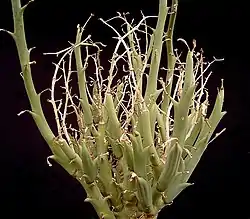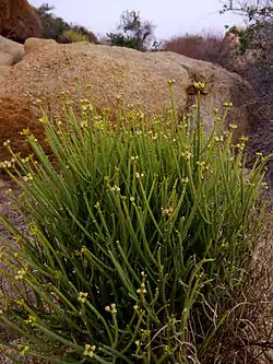 Es un arbusto perennifolio y carnoso que alcanza un tamaño de 0,45-1 m de altura, muy ramificada desde la base, el tallo primario de ± 2,5 cm de espesor, las ramas jóvenes convergentes hacia arriba, sin hojas, las ramas que se bifurcan alternativamente, formando una laxa parte superior plana en corimbo, de 10-15 cm de diámetro; es dioica.[2]