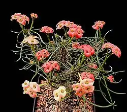 Euphorbia: nombre genérico que deriva del médico griego del rey Juba II de Mauritania (52 a 50 a. C. - 23), Euphorbus, en su honor – o en alusión a su gran vientre – ya que usaba médicamente Euphorbia resinifera. En 1753 Carlos Linneo asignó el nombre a todo el género.[7]