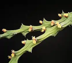 Es una planta suculenta perennifolia copetuda que alcanza los 15 cm de altura y 30 (-60) cm de diámetro, la ramificación es densa desde la base, en el ápice de una gruesa raíz carnosa; las ramas carnosas de 25 cm de largo y 5-10 mm de diámetro, cilíndricas, rara vez ramificadas excepto en la base , con dientes poco profundos ± prominentes.[2]