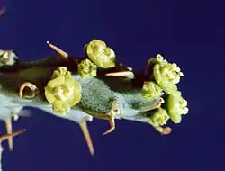 Euphorbia: nombre genérico que deriva del médico griego del rey Juba II de Mauritania (52 a 50 a. C. - 23), Euphorbus, en su honor – o en alusión a su gran vientre – ya que usaba médicamente Euphorbia resinifera. En 1753 Carlos Linneo asignó el nombre a todo el género.[6]