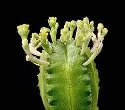 Euphorbia: nombre genérico que deriva del médico griego del rey Juba II de Mauritania (52 a 50 a. C. - 23), Euphorbus, en su honor – o en alusión a su gran vientre – ya que usaba médicamente Euphorbia resinifera. En 1753 Carlos Linneo asignó el nombre a todo el género.[5]