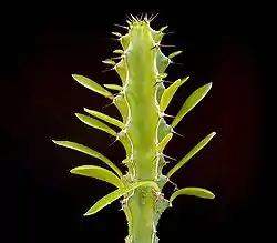 Es un arbusto o árbol que alcanza un tamaño de hasta ± 3 m de altura, por lo general notablemente menos, con tallo principal cilíndrico, con 5-7 ángulos, de unos 10 cm de diámetro con o sin ramas, y con ramas ascendentes, que mueren con la edad y se caen.