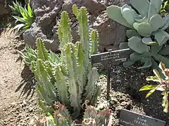 Euphorbia: nombre genérico que deriva del médico griego del rey Juba II de Mauritania (52 a 50 a. C. - 23), Euphorbus, en su honor – o en alusión a su gran vientre – ya que usaba médicamente Euphorbia resinifera. En 1753 Carlos Linneo asignó el nombre a todo el género.[5]
