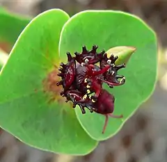 Euphorbia: nombre genérico que deriva del médico griego del rey Juba II de Mauritania (52 a 50 a. C. - 23), Euphorbus, en su honor – o en alusión a su gran vientre – ya que usaba médicamente Euphorbia resinifera. En 1753 Carlos Linneo asignó el nombre a todo el género.[4]