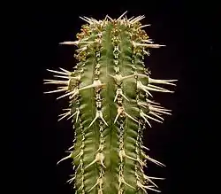 Es una planta suculenta perennifolia que alcanza un tamaño de 5-15 cm de altura, ramificación en su mayoría cerca de la base, formando grupos de 10 cm de diámetro; las ramas cilíndricas, de 1-2,5 cm de grosor, de 10 a 14 ángulos, ángulos separados por ranuras distintas, sinuosamente dentadas, con dientes 2-4 mm; espinosas.[2]