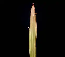 Es una planta suculenta columnar con las inflorescencias en ciatios.